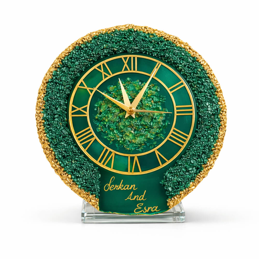 El işçiliğiyle üretilen epoksi gövdesi, zümrüt yeşilinin derin ve asil tonlarını altın yaldız detaylarla bir araya getirir. Epoksinin doğal yapısı sayesinde her ürün kendine özgü doku ve desenlere sahiptir; bu da her saati eşsiz kılar.